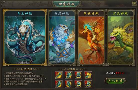 (2)可消耗青龙令、白虎令、朱雀令、玄武令,分别进入副本青龙神殿、白虎神殿、朱雀神殿、玄武神殿