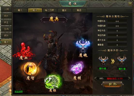 (2)魔体分为魔躯、魔魄、魔核、魔血、魔智5个部位,可消耗对应部位的修炼石升级,增加大量属性