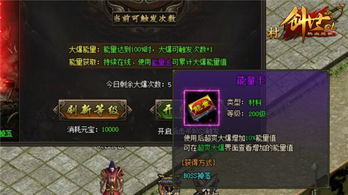 每日玩家有一定的大爆次数,初始进入是平平常常,所以必须提升大爆等级才能获得更丰厚的福利。前期提升大爆需要消耗元宝,提升到后续需要消耗少量钻石,当然等级越高,爆出来的物品价值就越高,大爆等级刷新后当日不在变更,次日0点重置。累积能量可以增加大爆次数,当能量积累到100%,可以增加1次触发大爆的次数;角色每在线10分钟,能量值就会增加10%;另外,使用能量卡也可增加能量值,击杀野外BOSS有一定概率掉落能量卡,每日大爆次数达到上限后,能量值就不再增加。