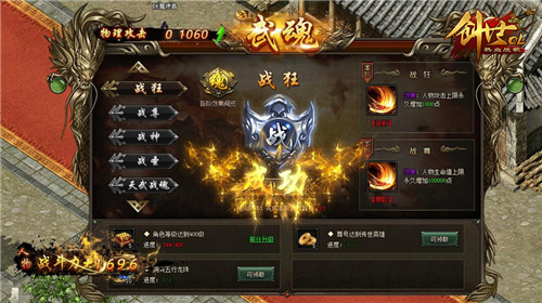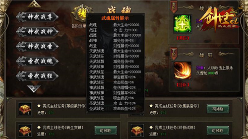 游戏中武魂主要分为四部分,即基础、天武、神武、圣武,相应的每个部分里又包含了战魂、战况、战尊、战神、战胜5项,根据顺序进行提升,可获得最大生命力、攻击力、减免怪伤、对怪暴伤、掉宝概率、攻击吸血、对怪爆率、吸血抵抗等属性加成,每一阶段获得的属性都不同,所有信息可以通过“各阶段效果阅览”查询。相较于其他养成玩法,战魂养成无需消耗任何金钱、精力,完成任务后点击“升阶”按钮即可一键升阶,非常轻松便捷。