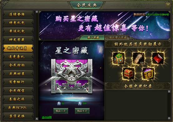 活动说明:活动期间,消耗幸运星可开启星之密藏,并有较高概率获得2倍奖励。更有机会额外获得超高价值的极品道具奖励。