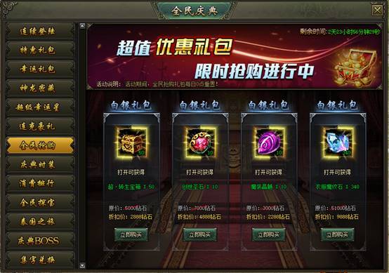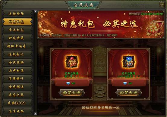 活动说明:活动期间,可购买特惠礼包,每个礼包每日限购1次,每日刷新!