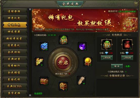 活动说明:活动期间,购买礼包获得抽奖次数,购买礼包次数和抽奖次数每日0点重置。