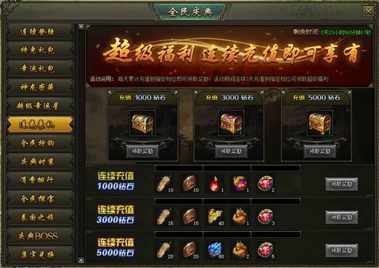 活动说明:每天累计充值到指定档位即可领取奖励,活动期间连续3天充值到指定档位可领取超级福利