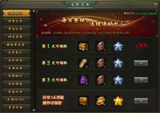 活动说明:活动期间,登陆游戏可领取不同天数的奖励,连续3天登陆可再领取额外奖励