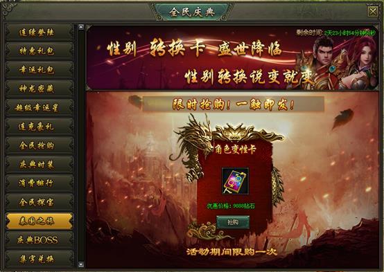 活动说明:活动期间,性别转换卡限时出售,机会难得,不可错过!