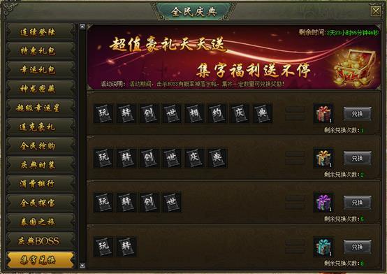 活动说明:活动期间,击杀BOSS概率掉落集字道具,集齐对应组合即可领取奖励