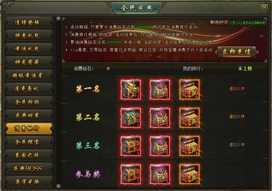 活动说明:活动期间,消费达到300000钻石的玩家参与排行,排名前三的玩家可获得珍稀道具、怒·生肖自选箱等奖励,奖励在活动结束后以邮件的方式进行发放