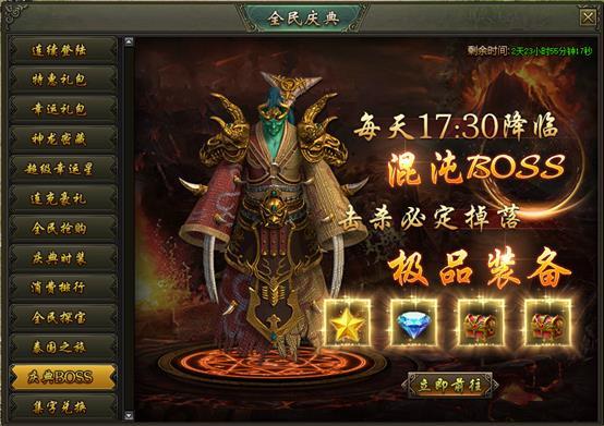 活动说明:活动期间,每天18:00混沌魔殿入口限时开启,全服玩家合力击败2大混沌BOSS,有机会获得海量元宝、钻石、稀有材料及高级装备奖励