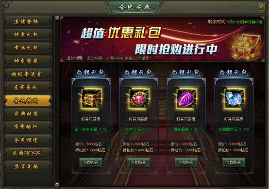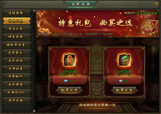 活动说明:活动期间,可购买特惠礼包,每个礼包每日限购1次,每日刷新!