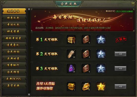 活动说明:活动期间,登陆游戏可领取不同天数的奖励,连续3天登陆可再领取额外奖励