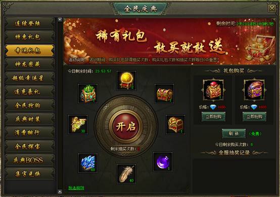 活动说明:活动期间,购买礼包获得抽奖次数,购买礼包次数和抽奖次数每日0点重置。