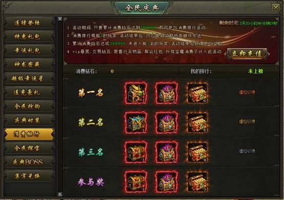 活动说明:活动期间,消费达到300000钻石的玩家参与排行,排名前三的玩家可获得珍稀道具、怒·生肖自选箱等奖励,奖励在活动结束后以邮件的方式进行发放