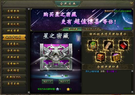 活动说明:活动期间,玩家使用幸运星开启星之密藏可获得各种奖励,更有较大几率获得2倍奖励及更高价值的额外奖励。