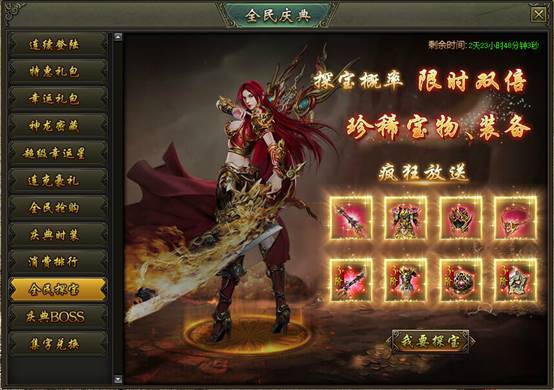 活动说明:活动期间,龙之宝藏产出圣装的概率限时翻倍,极品圣装、珍稀宝物大放送!