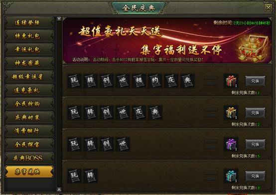 活动说明:活动期间,击杀BOSS概率掉落集字道具,集齐对应组合即可领取奖励