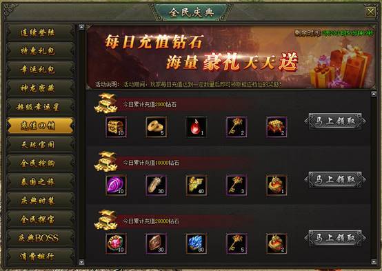 活动说明:活动期间,玩家每日充值达到一定数量后即可领取相应档位的奖励!