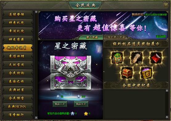 活动说明:活动期间,玩家使用幸运星开启星之密藏可获得各种奖励,更有较大几率获得2倍奖励及更高价值的额外奖励。