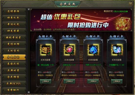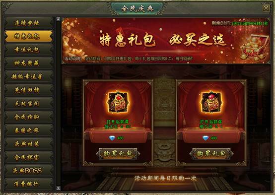 活动说明:活动期间,可购买特惠礼包,每个礼包每日限购1次,每日刷新!