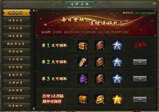 活动说明:活动期间,登陆游戏可领取不同天数的奖励,连续3天登陆可再领取额外奖励