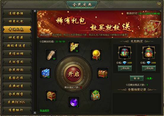活动说明:活动期间,购买礼包获得抽奖次数,购买礼包次数和抽奖次数每日0点重置。