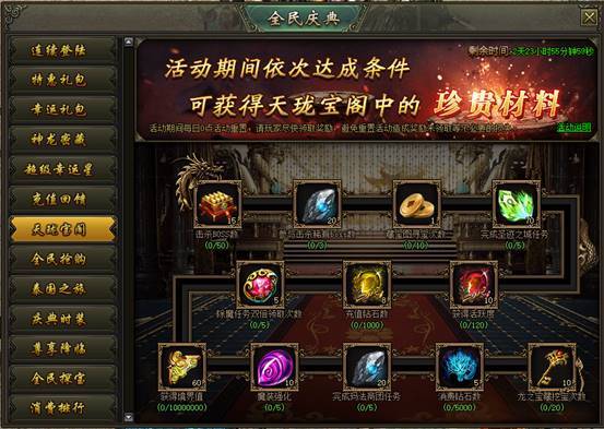 活动说明:活动期间,完成天珑宝阁内的对应任务条件可领取大量奖励。天珑宝阁每天24点重置