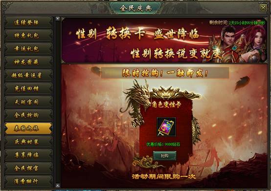 活动说明:活动期间,性别转换卡限时出售,机会难得,不可错过!