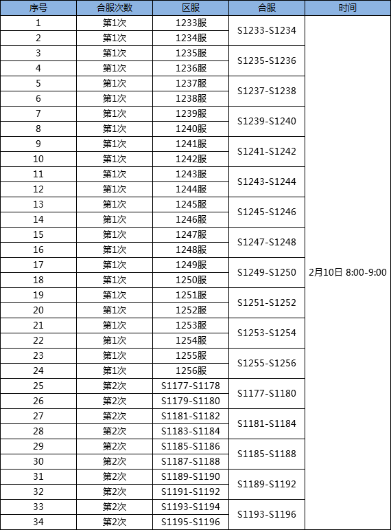 为了给您提供更好的游戏体验和感受,我们将在2020年2月10日对部分服务器进行合服操作,合服时间会因为数据量大小提前或延迟。服务器合服后,原服务器入口依然保留,参与合服的玩家依然可以选择老的服务器名进行进入。