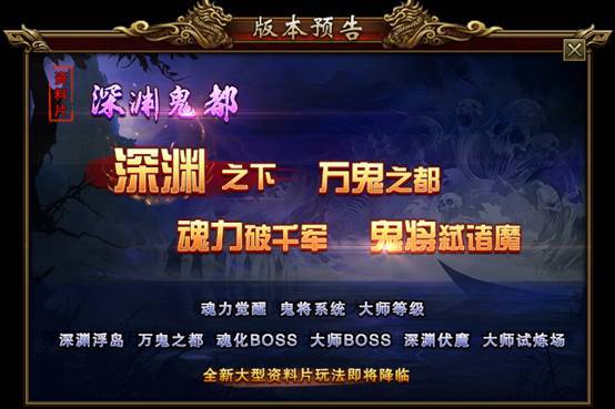 资料片深渊鬼都即将更新,全新地图深渊浮岛、万鬼之都开启全新探险,超级BOSS九幽鬼皇等你挑战!全新魂力、鬼将玩法带来全新体验!