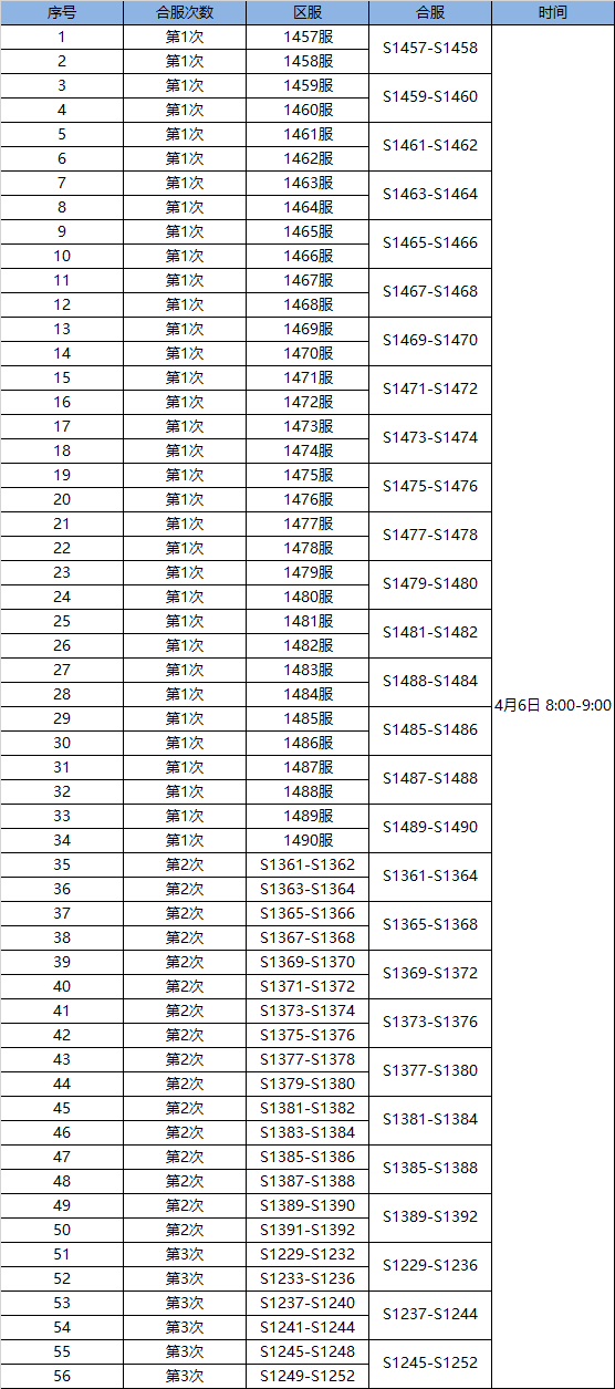 为了给您提供更好的游戏体验和感受,我们将在2020年4月6日对部分服务器进行合服操作,合服时间会因为数据量大小提前或延迟。服务器合服后,原服务器入口依然保留,参与合服的玩家依然可以选择老的服务器名进行进入。
