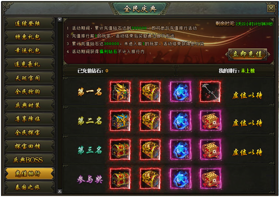 活动说明:活动期间,累计充值达到300000钻石的玩家参与排行,排名前三的玩家可获得珍贵装备、稀有道具等奖励,奖励在活动结束后以邮件的方式进行发放