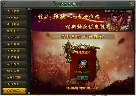 活动说明:活动期间,购买角色变性卡,可转换角色的性别