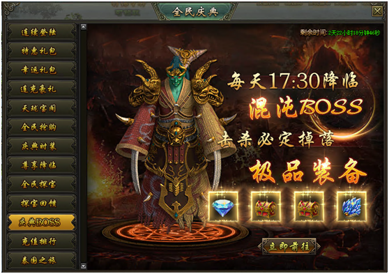 活动说明:活动期间,每天17:30降临混沌BOSS,击杀必定掉落极品装备