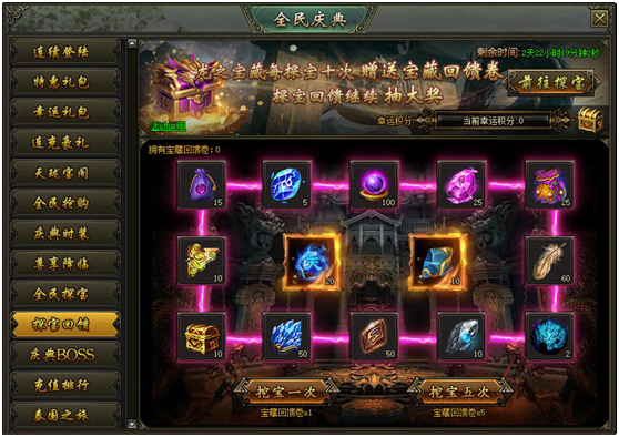 活动说明:活动期间,每在龙之宝藏探宝十次,即可获得一张宝藏回馈卷,继续抽大奖