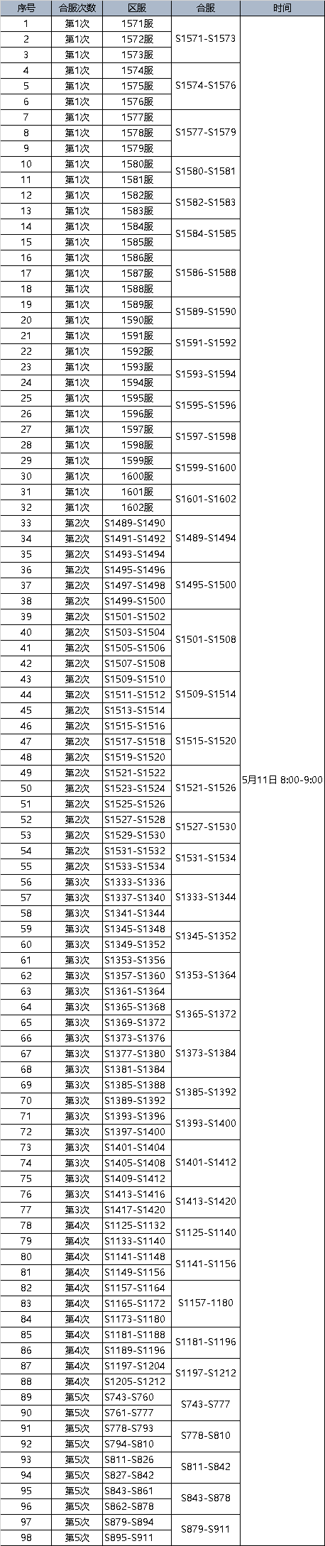 为了给您提供更好的游戏体验和感受,我们将在2020年5月11日对部分服务器进行合服操作,合服时间会因为数据量大小提前或延迟。服务器合服后,原服务器入口依然保留,参与合服的玩家依然可以选择老的服务器名进行进入。
