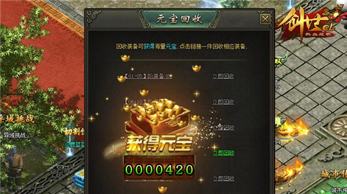 一听到“装备回收”,恐怕大伙儿第一时间想到的就是那句“装备回收秒到账”。创世大陆人气最高的“元宝回收”小哥可以帮你解决掉那些无用的装备,他的所在位置与治疗老人很近,在地图上没有明确显示出来,就是怕人太多才低调行事。找到他以后,可以将你背包里无用的低级装备统统回收,回收后会返还你丰厚的元宝,装备等级越高回收返还也就越多,拿上这些钱又可以尽情花啦!