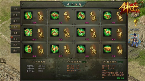 十二生肖套装集齐除了可以证明你在游戏里所做出的努力,更重要的是可以获得套装属性加成。进入十二生肖系统可以清楚地看见生肖总属性,集合物理攻击、物理防御、最大生命三项属性,有当前最高限值。当玩家穿戴6件套装后,会获得最小攻击、最小防御、最大生命三项属性加成;当集齐12件套装后,会获得暴伤抗性、韧性属性加成,此外还有定身LV1特别状态,攻击时3%的概率让敌人无法移动1.5秒,并降低其3%的防御,突破战场困境,尽情驰骋战场不费力!