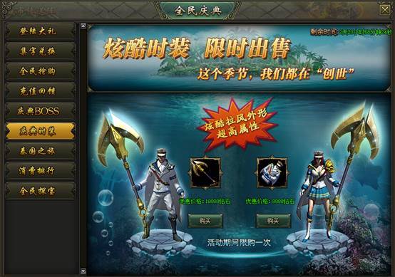 活动说明:活动期间,绝版时装限时出售,炫酷拉风外型、超高属性都在这里!