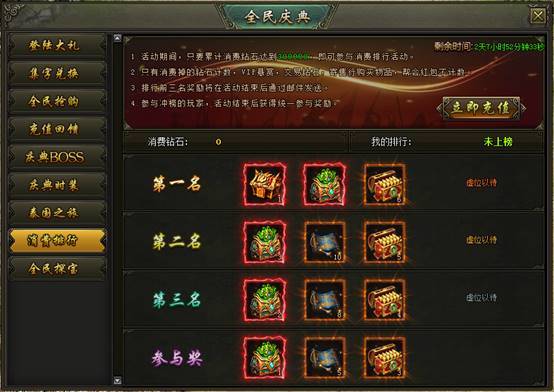 活动说明:活动期间,消费达到300000钻石的玩家参与排行,排名前三的玩家可获得高阶武器箱、魂级生肖宝箱等奖励,奖励在活动结束后以邮件的方式进行发放