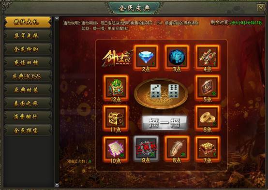 活动说明:活动期间,每日登录游戏,可免费摇筛子1次,根据点数有机会获得稀有材料、元宝匣、钻石等稀有奖励