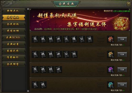 活动说明:活动期间,击杀BOSS概率掉落集字道具,集齐对应组合即可领取奖励