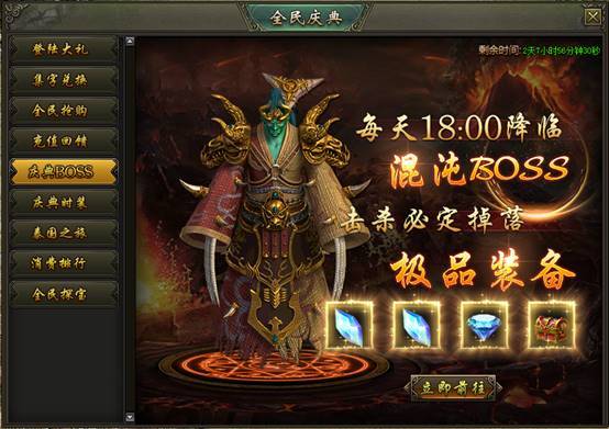 活动说明:活动期间,每天18:00混沌魔殿入口限时开启,全服玩家合力击败2大混沌BOSS,有机会获得海量元宝、钻石、稀有材料及高级装备奖励