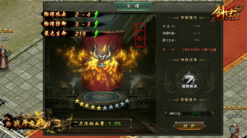 荣耀晋升从一阶开始就需要消耗10万元宝,听起来很吓人对不对,但是在《热血战歌创世》里,这些元宝都是毛毛雨,几件装备回收就能海赚一大笔。备足元宝后,点击【提升】,系统便会自动升级,升级后提升物理攻击、物理防御以及最大生命三种属性,同时战斗力也会得到很大升华。随着等阶的逐渐晋升,消耗元宝数量也会逐渐增多,所以小伙伴们切记一点“多刷怪、多爆装”,毕竟没有什么比回收装备换取金钱更容易了。