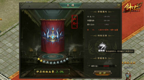 荣耀系统开启没有太多限制,当玩家角色达到250级后即可开启你的成长之路。荣耀系统开启后,我们会率先看到它的主面板。面板左侧为我们即将晋升的阶段,右侧则记录了荣耀属性、特殊效果以及荣耀晋升所需消耗的元宝数量。