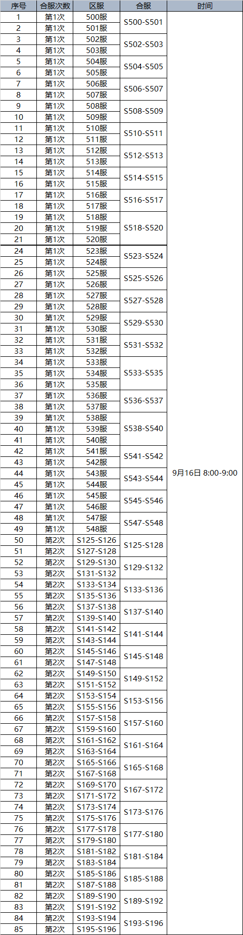 为了给您提供更好的游戏体验和感受,我们将在2019年9月16日对部分服务器进行合服操作,合服时间会因为数据量大小提前或延迟。服务器合服后,原服务器入口依然保留,参与合服的玩家依然可以选择老的服务器名进行进入。