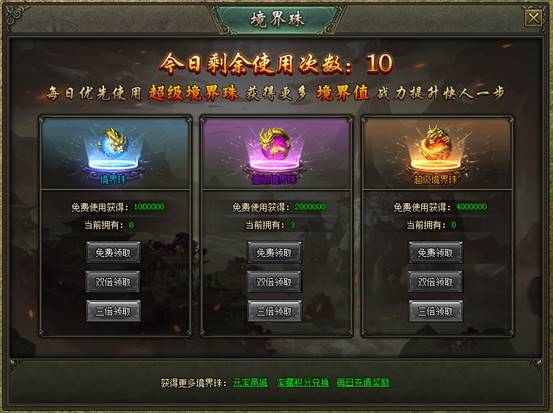 (6)普通境界珠通过元宝商城购买获得,高级境界珠通过宝藏积分兑换获得,超级境界珠通过每日充值奖励获得