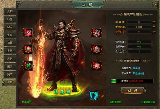 (2)可消耗境界值来提升破境等阶,提升后可增加全新护甲相关属性,并可佩带破境装备(3)破境装备: