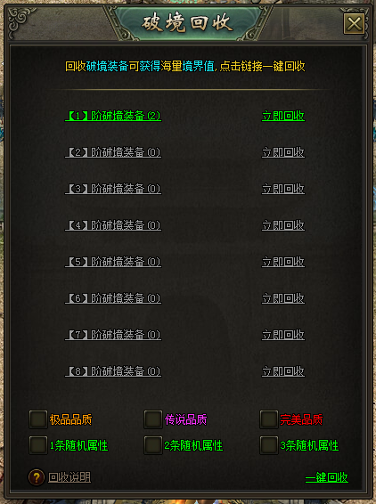 (3)可通过勾选不同选项,来决定各品质装备及带有极品属性的装备是否回收