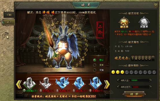(3)提升破灵可增加破灵攻击,并使BOSS陷入变羊状态,对人物造成伤害降低为1点