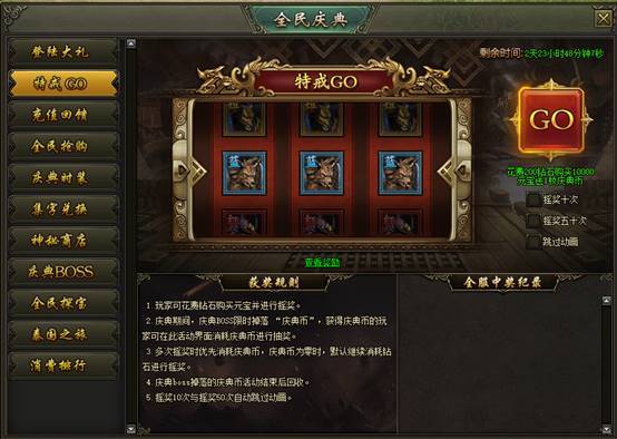 活动说明:活动期间,限时摇奖获得大量稀世特戒碎片